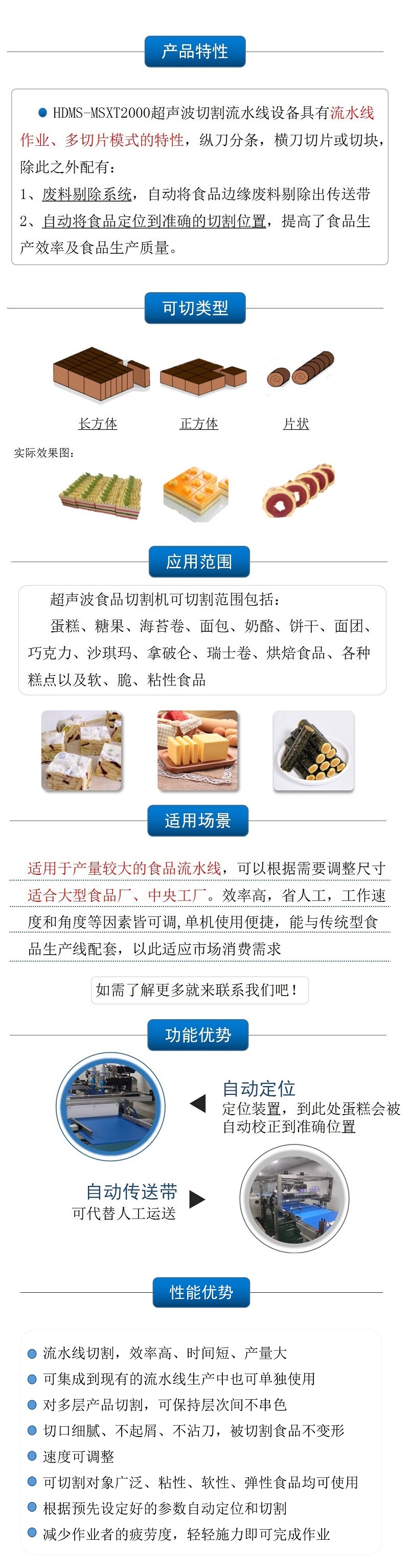該設(shè)備配備雙把超聲波刀片,既可切方蛋糕,也可同時切兩個圓蛋糕,還具有自動上水洗刀、安全光柵的人性化功能,效率高,更方便 |
